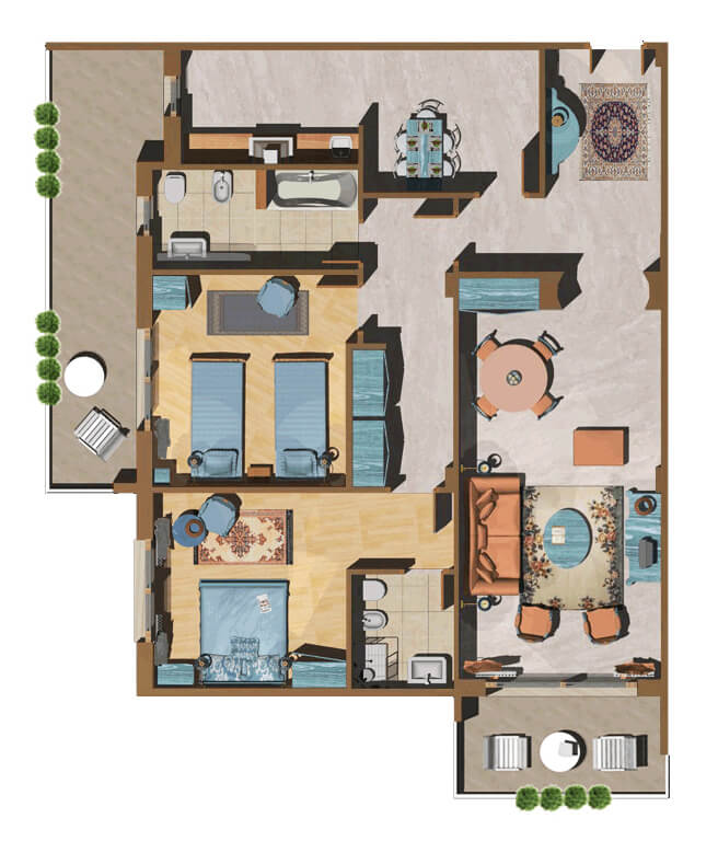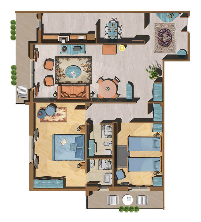 “Il vero lusso è lo spazio”- Questo tipo di appartamento, molto raffinato e dalla metratura generosa, si compone di un ampio salotto, una cucina con tinello, una camera con letto matrimoniale con bagno en suit e un’altra con 2 letti singoli. Fino a due persone possono dormire in salotto sui divani letto. Perfetto per chi vuole vivere con gran comodità la propria casa. Si può scegliere tra 2 diverse tipologie, con la stessa composizione, ma differente disposizione e affacci. Gli ospiti possono fruire sia del giardino condominiale, sia degli spazi esterni privati, compreso il panoramico Roof garden con vista sulla cupola di San Pietro. E’ anche possibile prendere in affitto un posto auto nell’autorimessa del residence. Il condominio è dotato di portineria, la mattina.